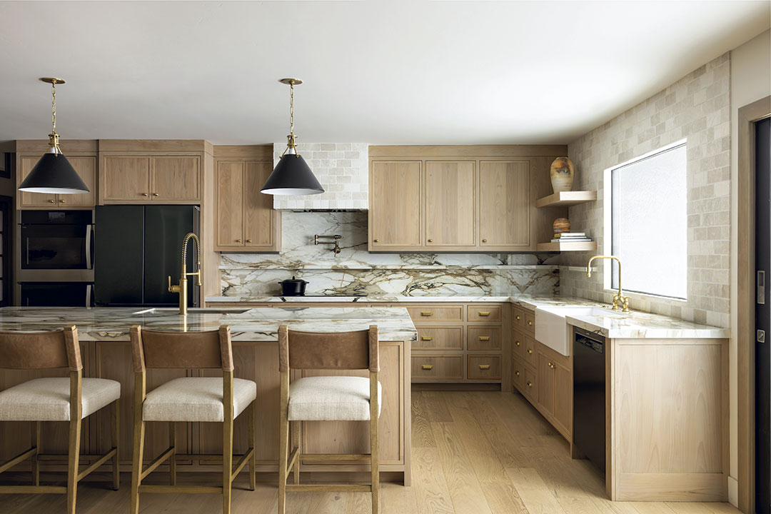 “Neutrals are being paired with natural materials like wood and marble in a way that feels much richer than the ‘all‑white everything’ era,” details Bolger. She adds that wood cabinetry is “having a real moment again, especially when it’s done in softer, warmer stains. It brings so much warmth and texture into a space, and when you pair it with beautiful natural stones, the whole look feels elevated but still very calm and livable.”